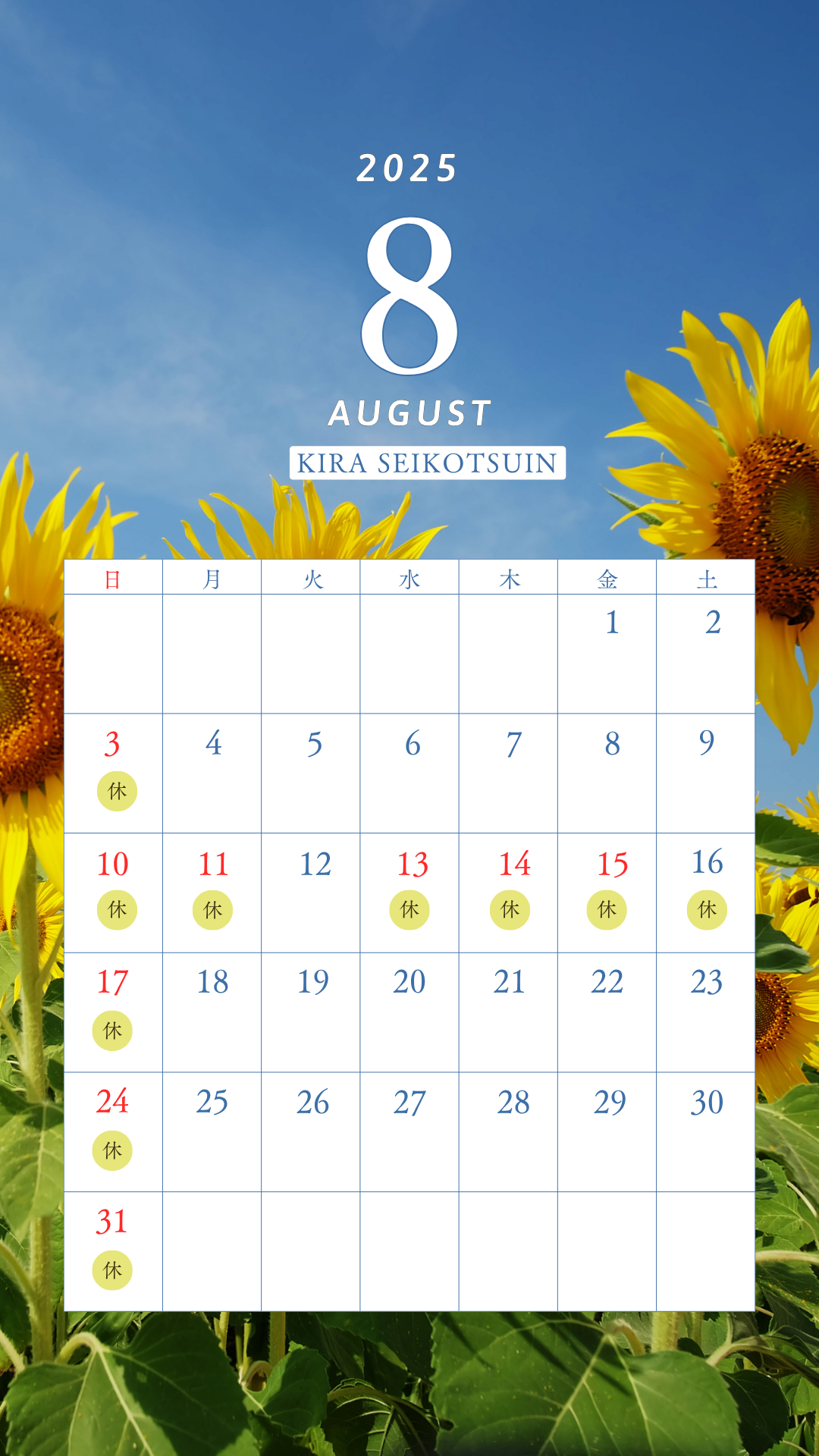 令和7年8月休診日のご案内 2025年07月30日 令和7年8月休診日のご案内を致します。 3日(日)・10日(日)・11日(月祝) 13日(水)~17日(日) 夏季休暇 24日(日)・31日(日) « 令和7年7月休診日のご案内 令和7年9月休診日のご案内 »